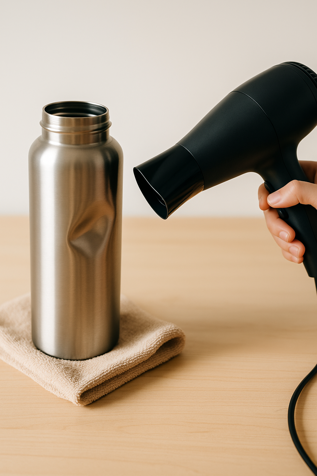 「水筒を落としてへこんだ。ドライヤーで直せる?」という疑問に、安全に配慮しながら自分で試せる現実的な方法をまとめました。結論から言うと、一重構造(シングルウォール)の金属ボトルや、薄い金属カップ類は直せる可能性が比較的あります。一方で、真空断熱の二重構造(ステンレス魔法びんタイプ)は直せない場合が多く、むしろ破損や保温力低下のリスクが上がります。本稿では、ドライヤーを使う基本テクニック、素材別のコツ、トラブル時の見極め、作業ステップ、修理後のケアまで、購入先への相談が必要になる境界も含めて丁寧に解説します。