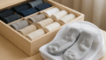 - 収納ボックスを買う前に、棚の内寸を測り、余裕が何センチあるか確認する
