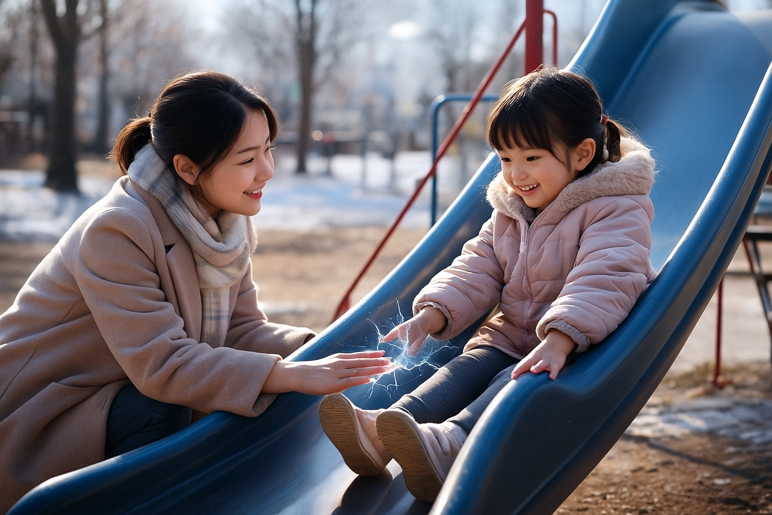 冬は一年の中でも特に静電気を感じやすい季節です。公園の滑り台や手すり、車のドアなど、日常のあらゆる場面で「パチッ」となるため、子どもと一緒のお出かけが少し憂うつになることもあります。ここでは、なぜ冬に静電気が増えるのか、特に滑り台で起こりやすいのかを整理しておきましょう。